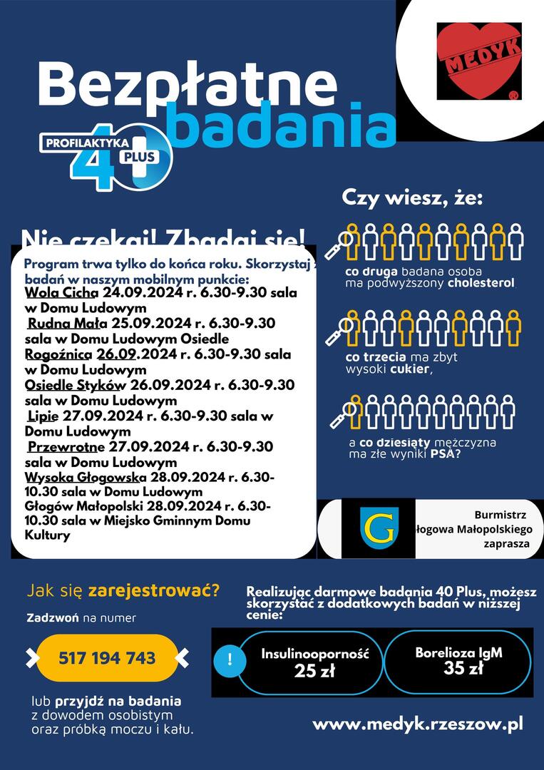 W ramach programu Profilaktyka 40 Plus Burmistrz Miasta i Gminy Głogów Małopolski oraz Centrum Medyczne "MEDYK" zapraszają osoby po 40. roku życia na bezpłatne badania, które rozpoczynają się na terenie naszej gminy.