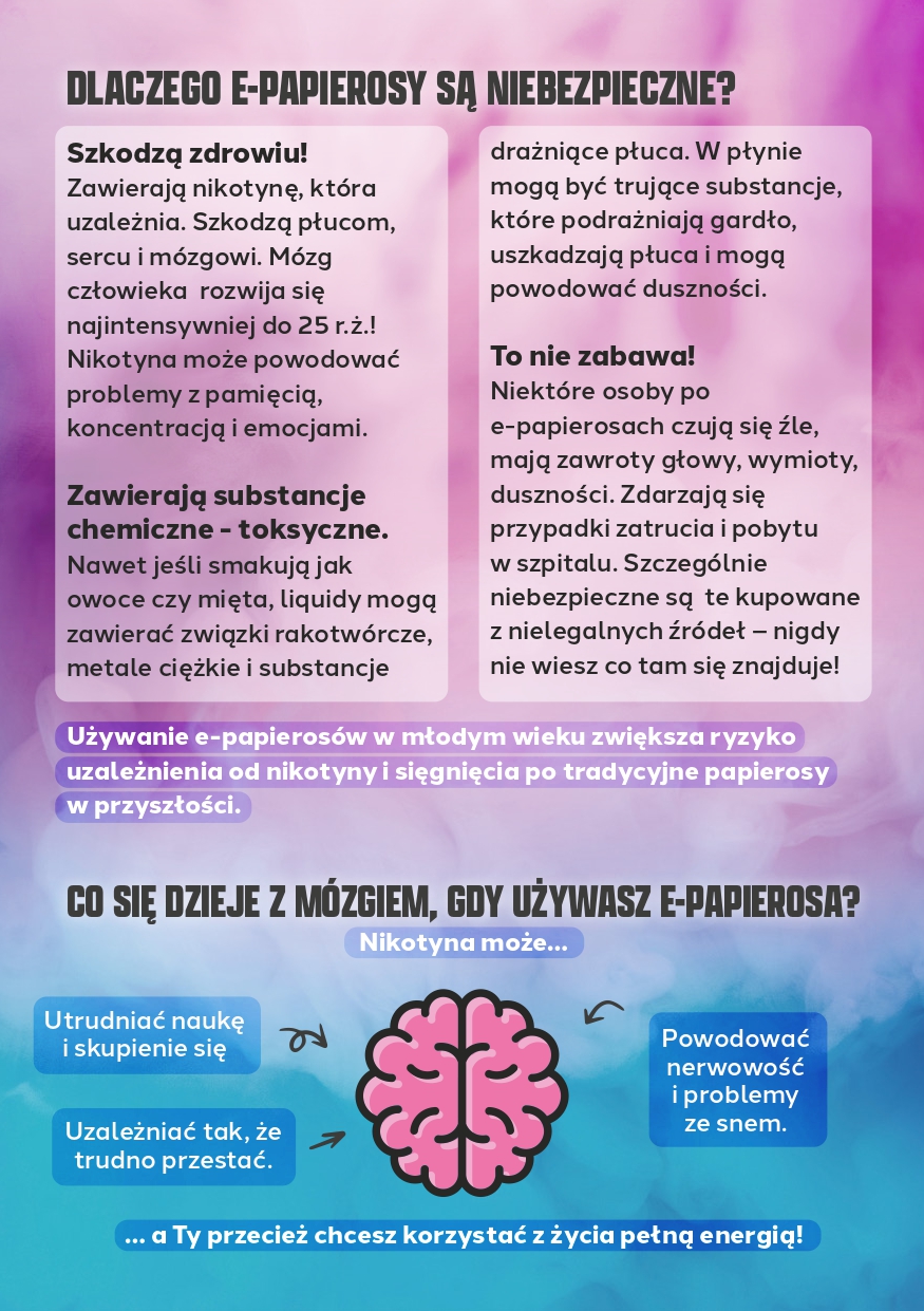 E-papierosy w ostatnich latach stały się bardzo popularne wśród młodzieży. Wielu rodziców nie zdaje sobie sprawy, że ich dzieci sięgają po te produkty, bo często przypominają pendrive’y, długopisy, kosmetyki czy inne gadżety. Wbrew popularnym mitom, e-papierosy nie są bezpieczne. W większości zawierają nikotynę – silnie uzależniającą substancję, która wpływa negatywnie na rozwijający się mózg nastolatka. W ich składzie znajdują się również szkodliwe substancje chemiczne, które mogą powodować podrażnienia dróg oddechowych, obniżenie odporności, a także zaburzenia koncentracji i nastroju.