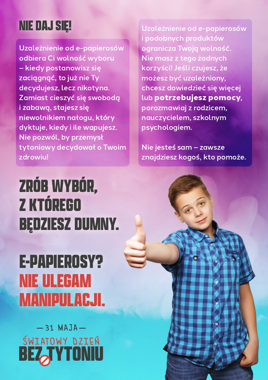 Z okazji Światowego Dnia bez Tytoniu, obchodzonego 31 maja, Główny Inspektorat Sanitarny zainaugurował kampanię „E-papierosy to manipulacja!”. Jej celem jest zwiększenie świadomości społecznej – w szczególności wśród młodzieży, rodziców i nauczycieli – na temat szkodliwości nowych wyrobów nikotynowych oraz taktyk wykorzystywanych przez producentów tych produktów. W tym roku ten dzień obchodzony jest pod hasłem „Demaskowanie atrakcyjności wyrobów tytoniowych i nikotynowych”. Ponad 22% młodzieży w wieku 13–15 lat w Polsce używa e-papierosów – to efekt m.in. celowanych działań marketingowych producentów. Chronimy dzieci i młodzież przed nikotyną i uzależniającymi nawykami.