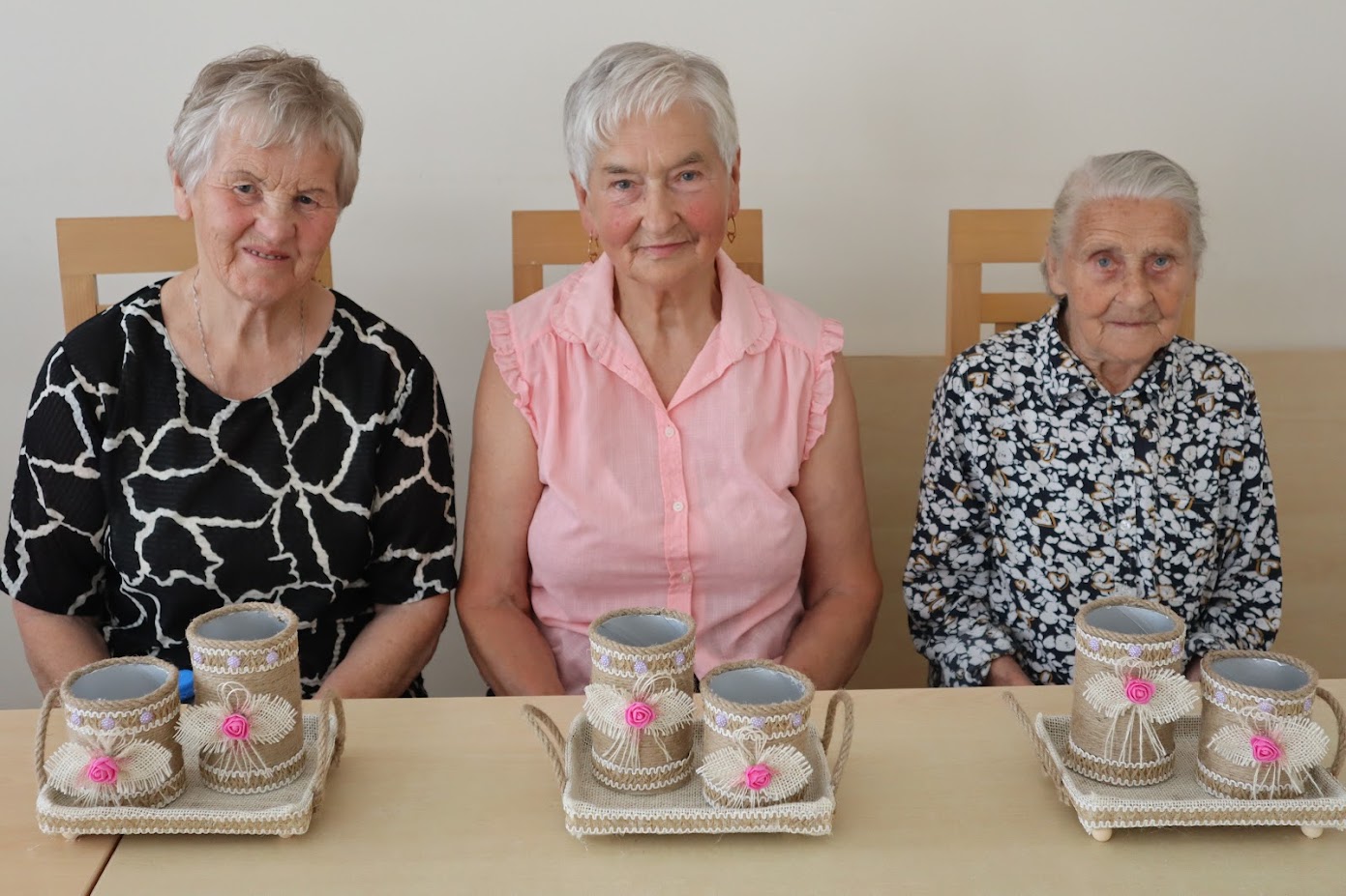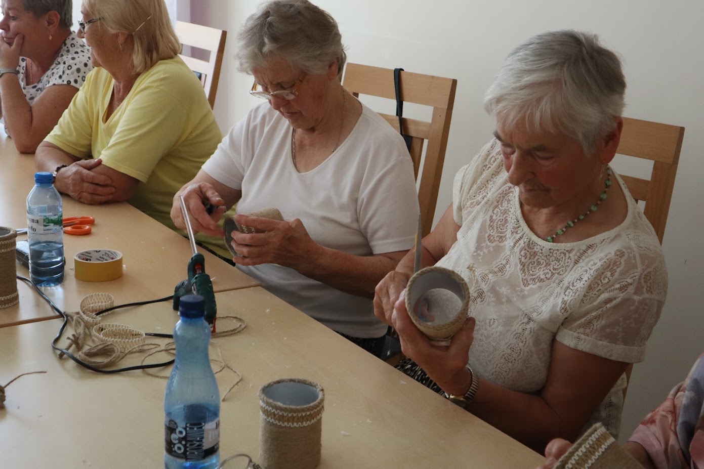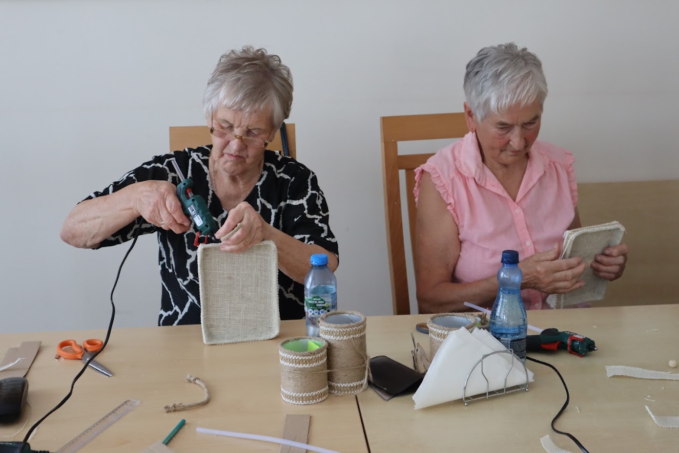 🎨 Nie mniej twórczo upłynęły ostatnie zajęcia plastyczne, podczas których seniorzy stworzyli piękne ozdoby z materiałów naturalnych. Efektem pracy są dwie dekoracyjne puszki umieszczone na tacy – całość utrzymana w rustykalnym stylu i ozdobiona jutą. To wyjątkowe dekoracje, które oprócz walorów estetycznych są również symbolem kreatywności i zaangażowania naszych uczestników.