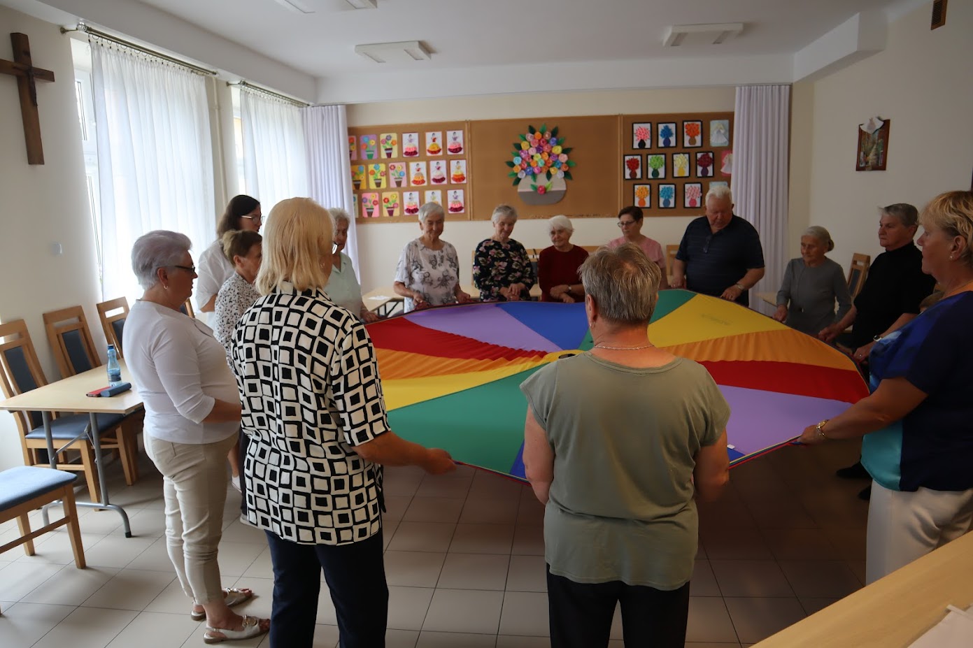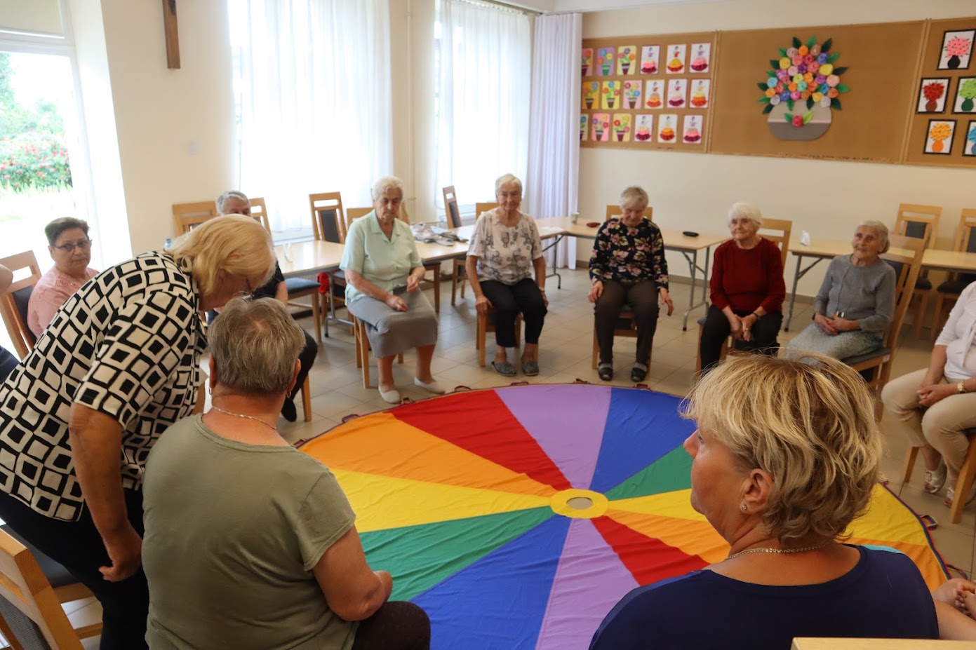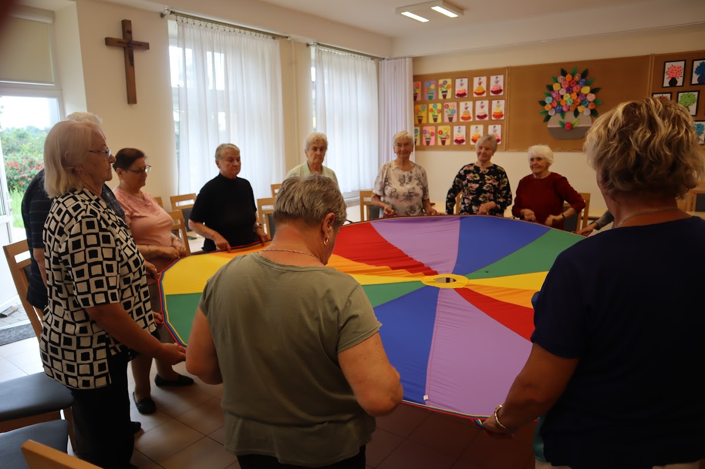 Uczestnicy naszego domu w ostatnim czasie mieli okazję wziąć udział w wyjątkowych zajęciach ruchowo-integracyjnych z wykorzystaniem kolorowej chusty KLANZA. Ta prosta, a zarazem niezwykle inspirująca forma aktywności wniosła mnóstwo uśmiechu, radości i pozytywnej energii. Seniorzy z entuzjazmem angażowali się we wspólne ćwiczenia i zabawy, a atmosfera była pełna śmiechu i rozmów. To kolejne potwierdzenie, że aktywna „jesień życia” może być barwna, pełna ruchu i wspólnej radości.