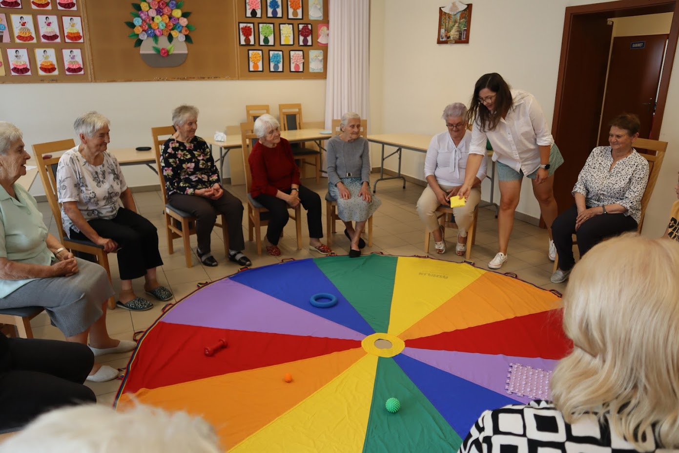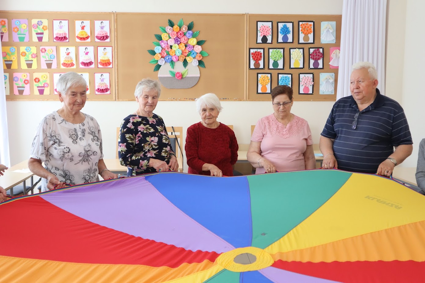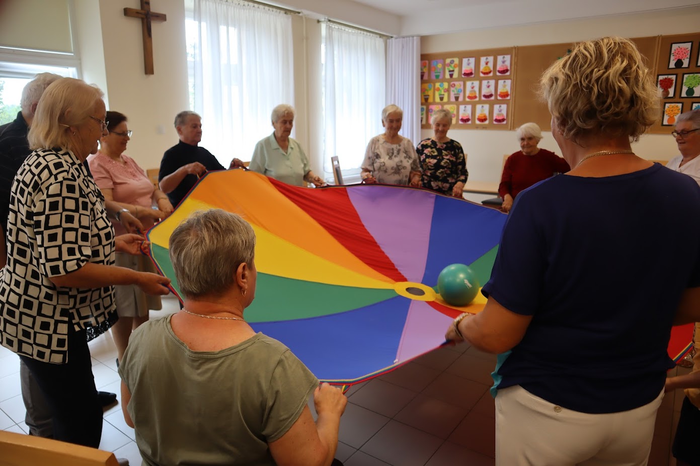Uczestnicy naszego domu w ostatnim czasie mieli okazję wziąć udział w wyjątkowych zajęciach ruchowo-integracyjnych z wykorzystaniem kolorowej chusty KLANZA. Ta prosta, a zarazem niezwykle inspirująca forma aktywności wniosła mnóstwo uśmiechu, radości i pozytywnej energii. Seniorzy z entuzjazmem angażowali się we wspólne ćwiczenia i zabawy, a atmosfera była pełna śmiechu i rozmów. To kolejne potwierdzenie, że aktywna „jesień życia” może być barwna, pełna ruchu i wspólnej radości.
