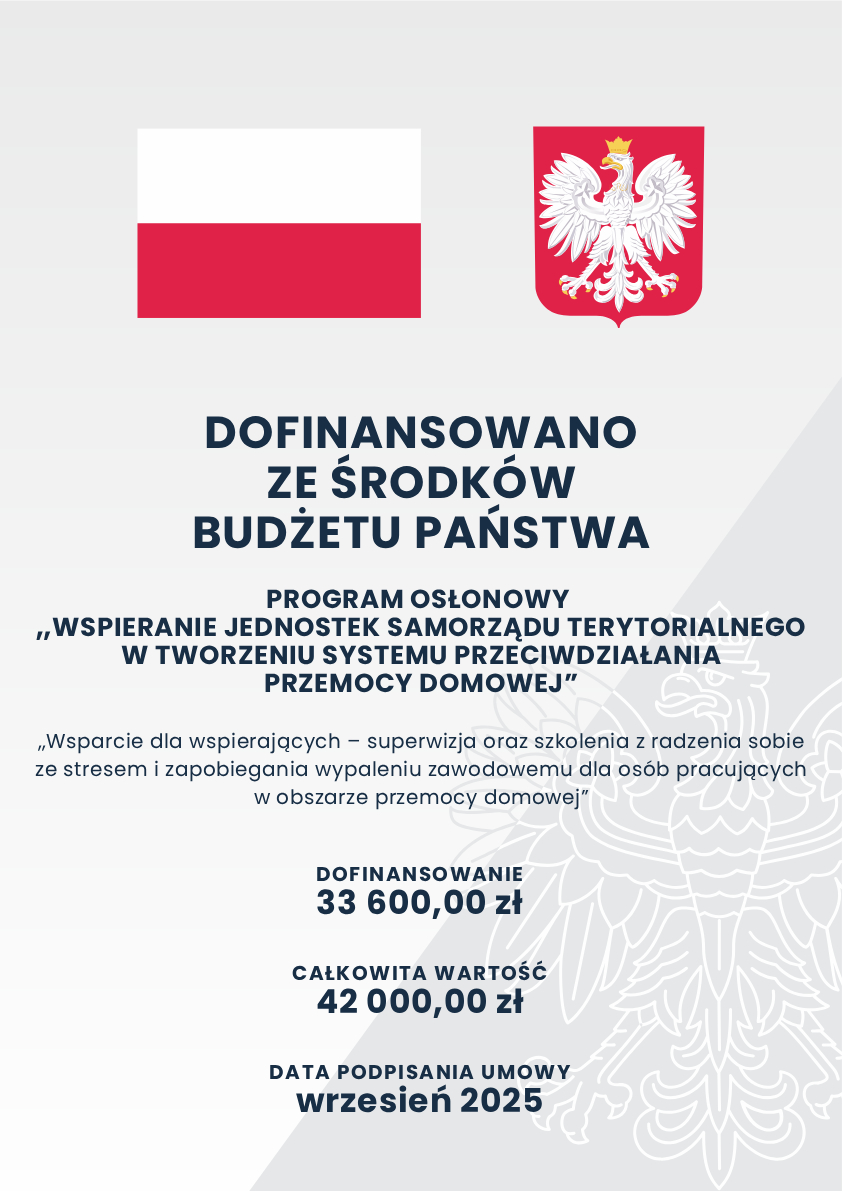 Zadanie dofinansowano w ramach programu osłonowego „Wspieranie jednostek samorządu terytorialnego w tworzeniu systemu przeciwdziałania przemocy domowej jako przemocy ze względu na płeć”.