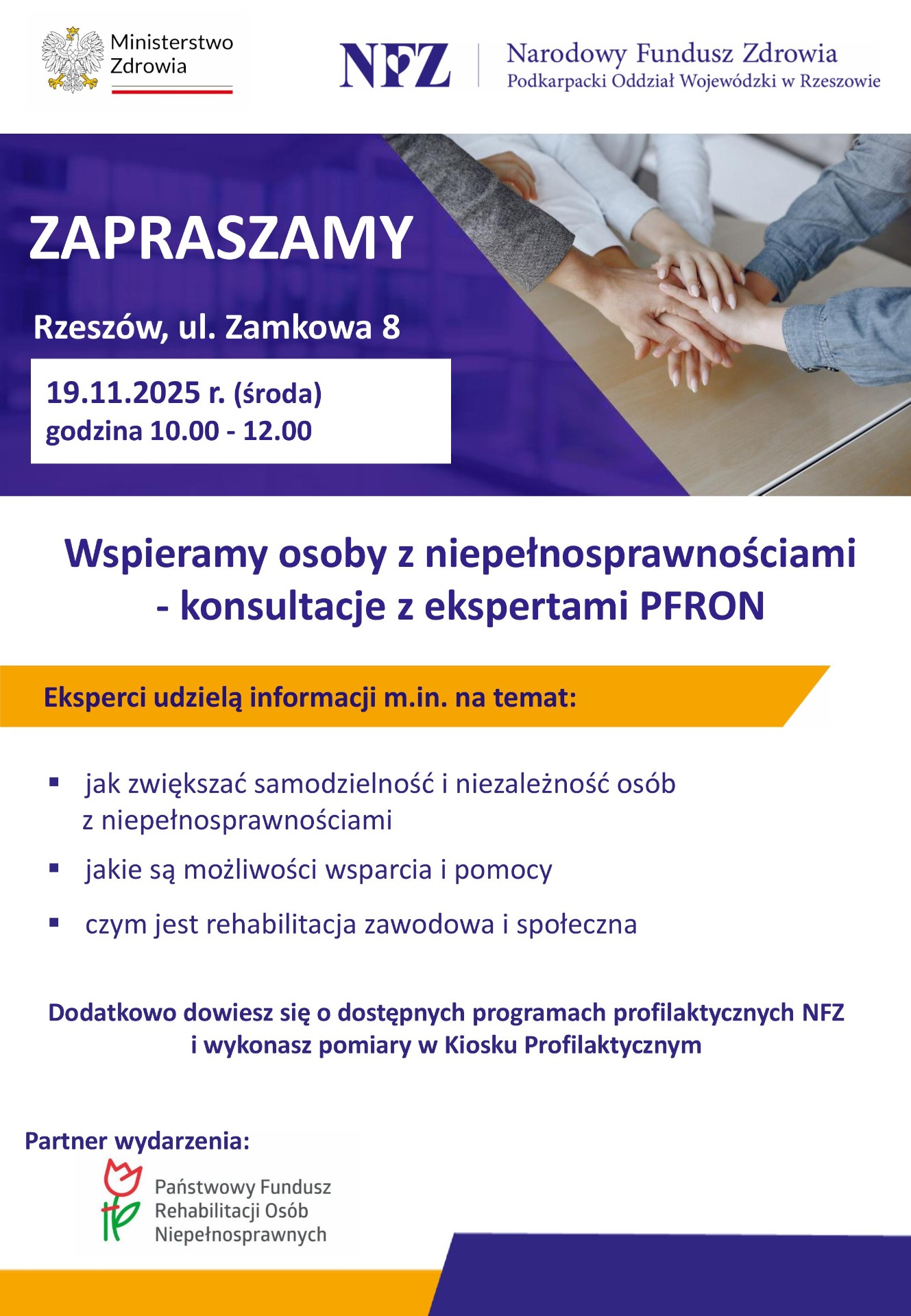 W imieniu organizatorów zapraszamy na konsultacje z przedstawicielami Państwowego Funduszu Rehabilitacji Osób Niepełnosprawnych (PFRON), które odbędą się w Podkarpackim Oddziale Wojewódzkim Narodowego Funduszu Zdrowia w Rzeszowie.