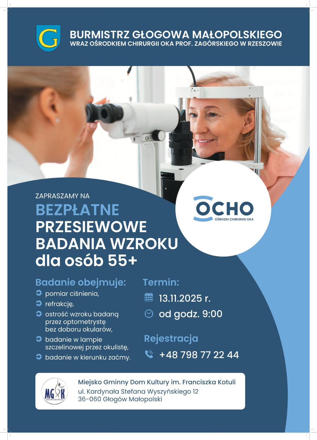 Burmistrz Głogowa Małopolskiego wraz z Ośrodkiem Chirurgii Oka prof. Zagórskiego w Rzeszowie serdecznie zapraszają osoby w wieku 55+ na bezpłatne badania wzroku.