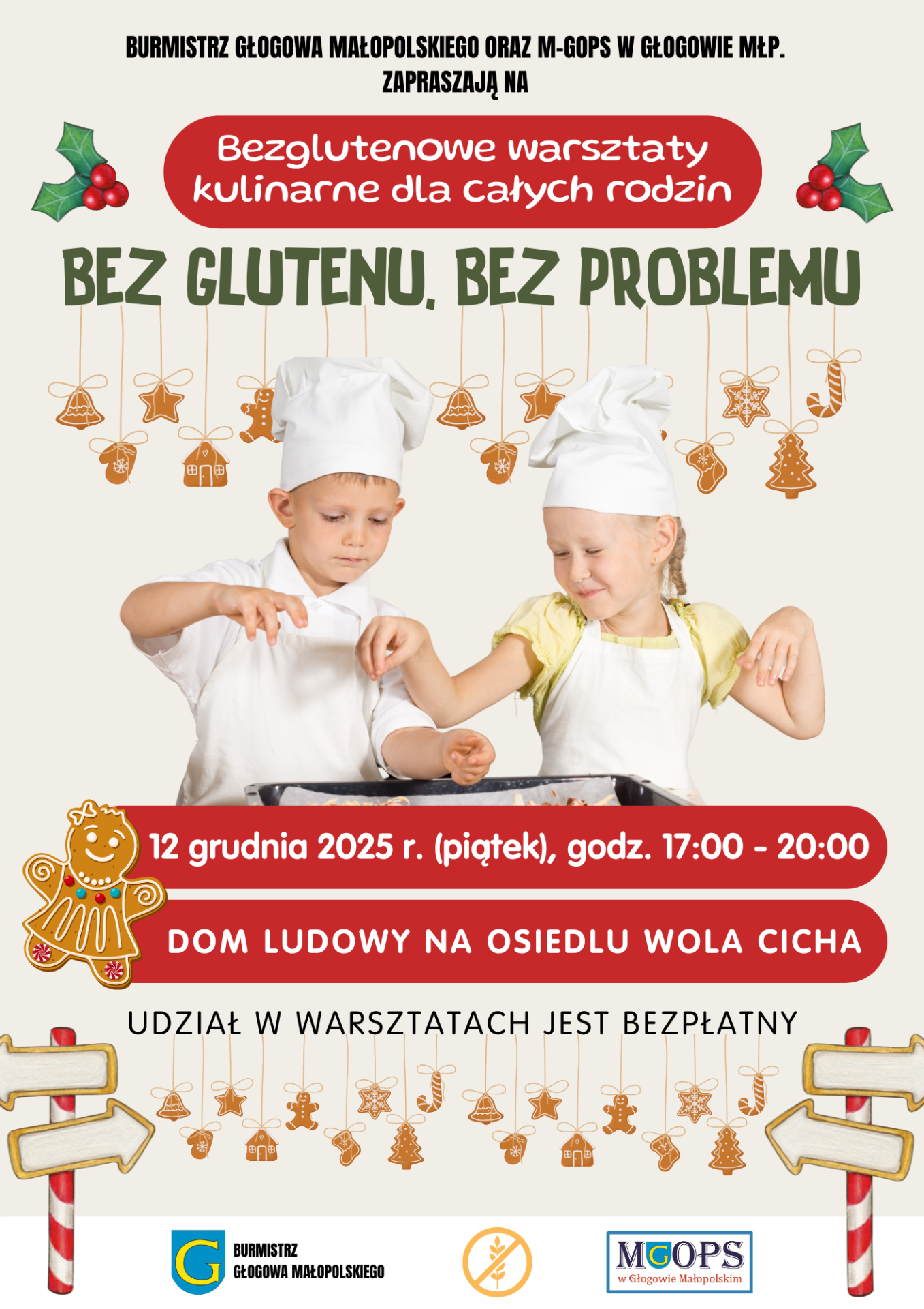 Burmistrz Głogowa Małopolskiego oraz Miejsko-Gminny Ośrodek Pomocy Społecznej w Głogowie Małopolskim zapraszają na wyjątkowe, rodzinne warsztaty kulinarne poświęcone bezglutenowym wypiekom. To praktyczne zajęcia stworzone z myślą o rodzinach, w których występuje potrzeba stosowania diety bezglutenowej – dla dziadków, rodziców i dzieci. Wspólnie przygotujemy bezglutenowe ciasteczka: od wyrabiania ciasta, przez pieczenie, aż po dekorowanie gotowych wypieków.