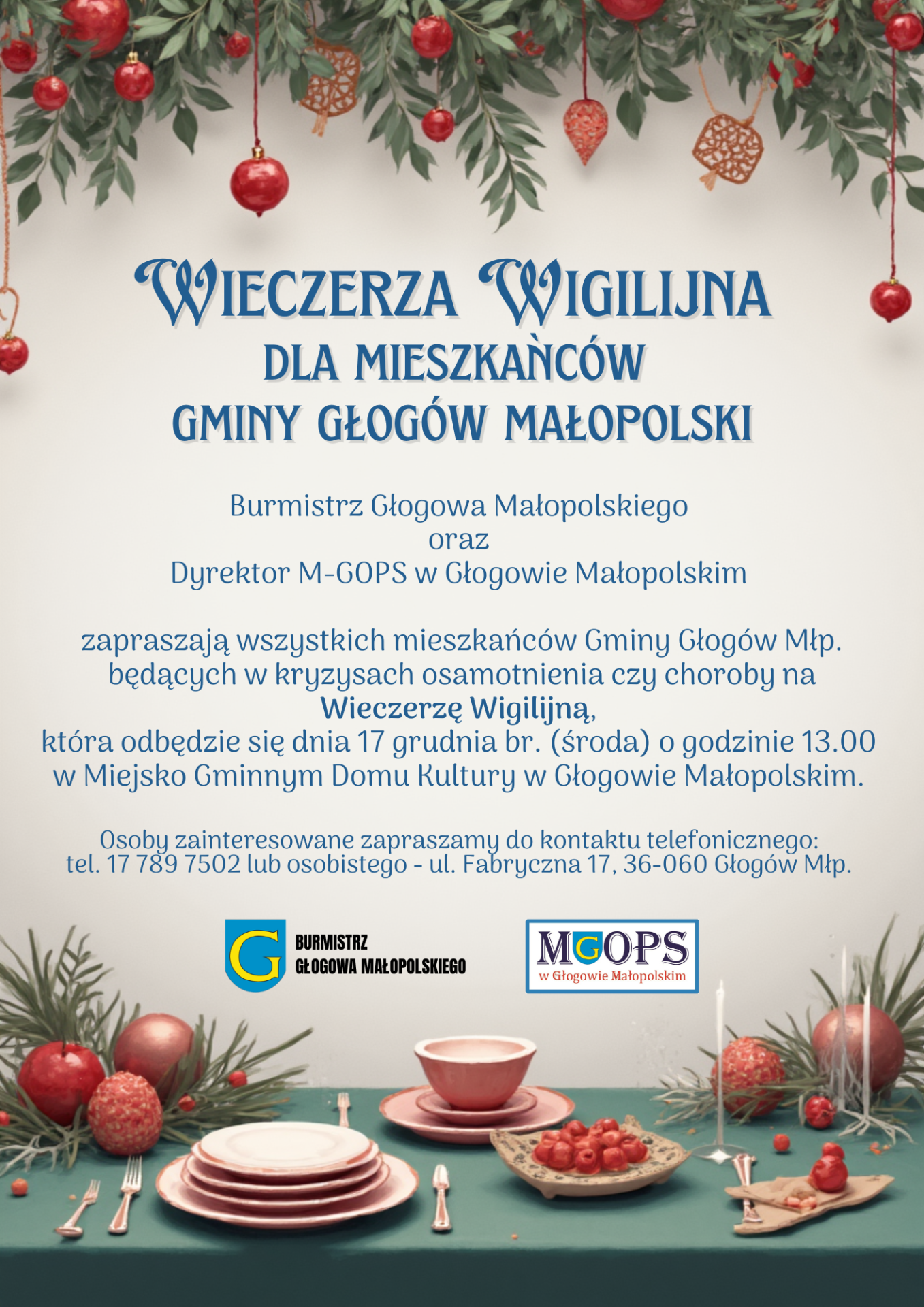 Burmistrz Głogowa Małopolskiego oraz Dyrektor Miejsko-Gminnego Ośrodka Pomocy Społecznej serdecznie zapraszają osoby na Wigilijną Wieczerzę, która odbędzie się 17 grudnia (środa) o godz. 13.00 w Miejsko Gminnym Domu Kultury w Głogowie Małopolskim. Na uczestników czekać będzie ciepły wigilijny posiłek, świąteczne paczki, modlitwa, kolędowanie i życzenia.