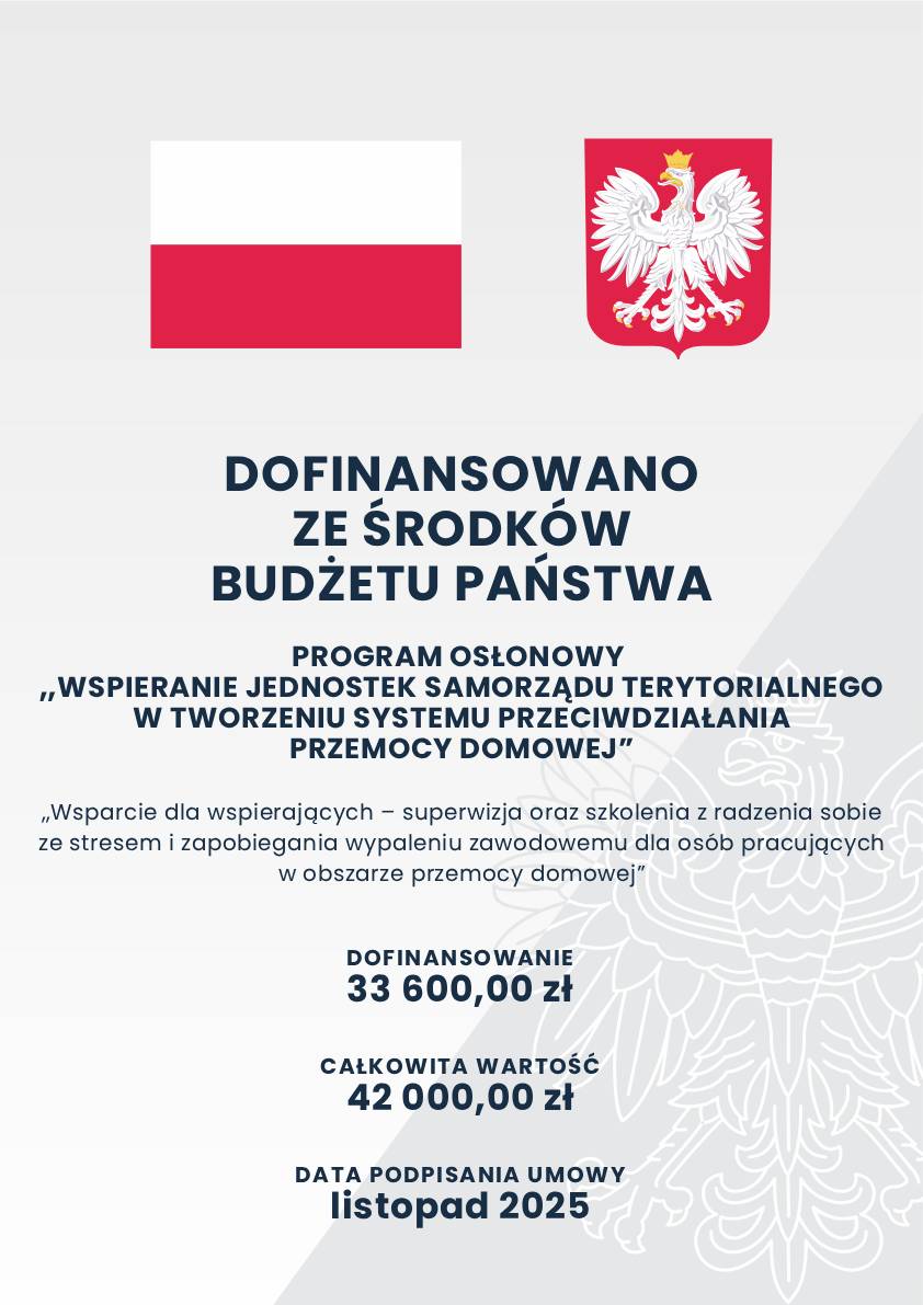 Zadanie publiczne finansowane jest z budżetu państwa – Kancelarię Prezesa Rady Ministrów w ramach Programu Osłonowego „Wspieranie Jednostek Samorządu Terytorialnego w tworzeniu systemu przeciwdziałania przemocy domowej jako przemocy ze względu na płeć”. Całkowity koszt realizacji projektu wynosi 42 000,00 zł, z czego 33 600,00 zł stanowi dofinansowanie z budżetu państwa.